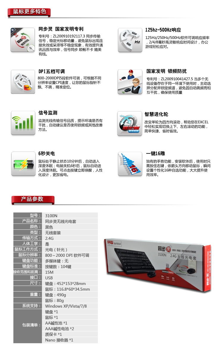 - 商品名称:双飞燕 A4Tech 3100N无线键鼠套装